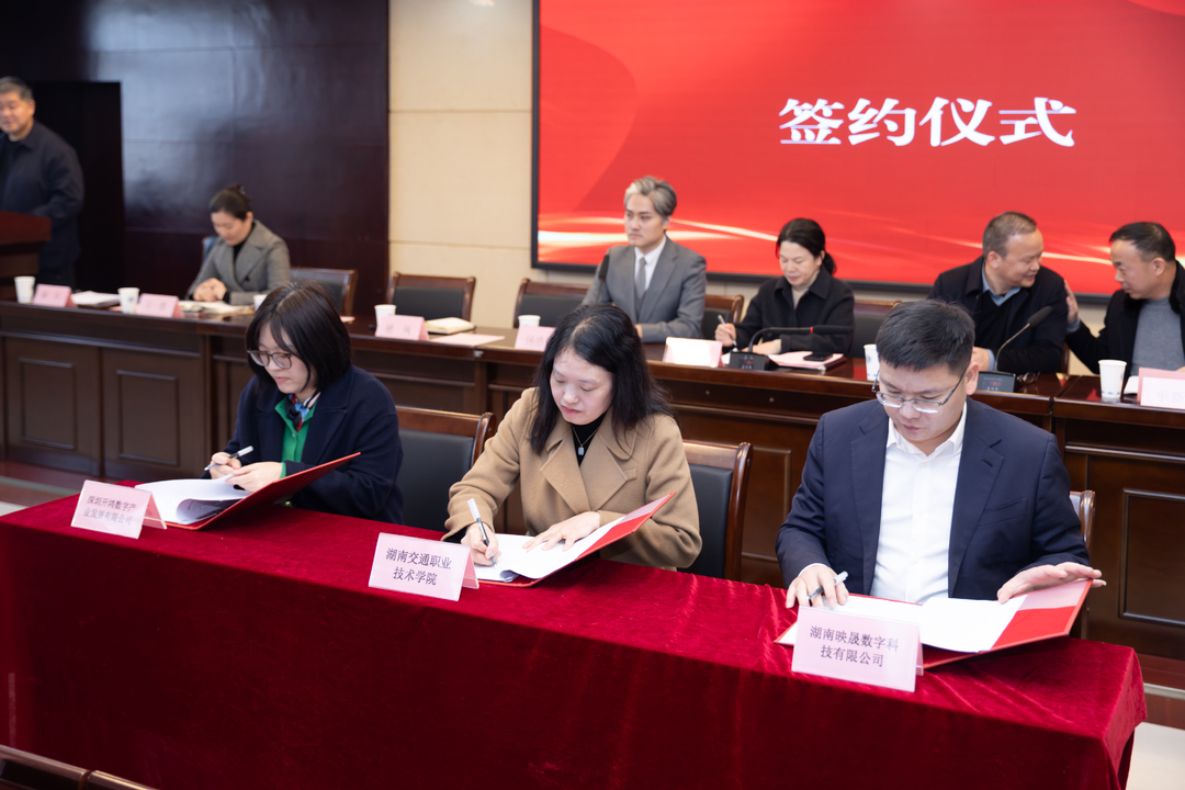 1月5日上午,湖南交通职业技术学院、深圳开鸿数字产业发展有限公司与湖南省神州映晟产教融合控股集团有限公司在学院行政楼B503会议室正式签署《映晟开鸿数字产业学院战略合作框架协议》,宣告三方共建的“映晟开鸿数字产业学院”正式启动。学院党委书记覃佐媛、纪委书记单新周、副院长褚凤;神州映晟产教融合集团董事长李光映、总经理吴名为;深圳开鸿数字产业发展有限公司教育系统部总经理汤浩竹、销售总监黄晓婷出席签约仪式。校企双方相关部门负责人、教师代表及70余名学生共同见证这一时刻。