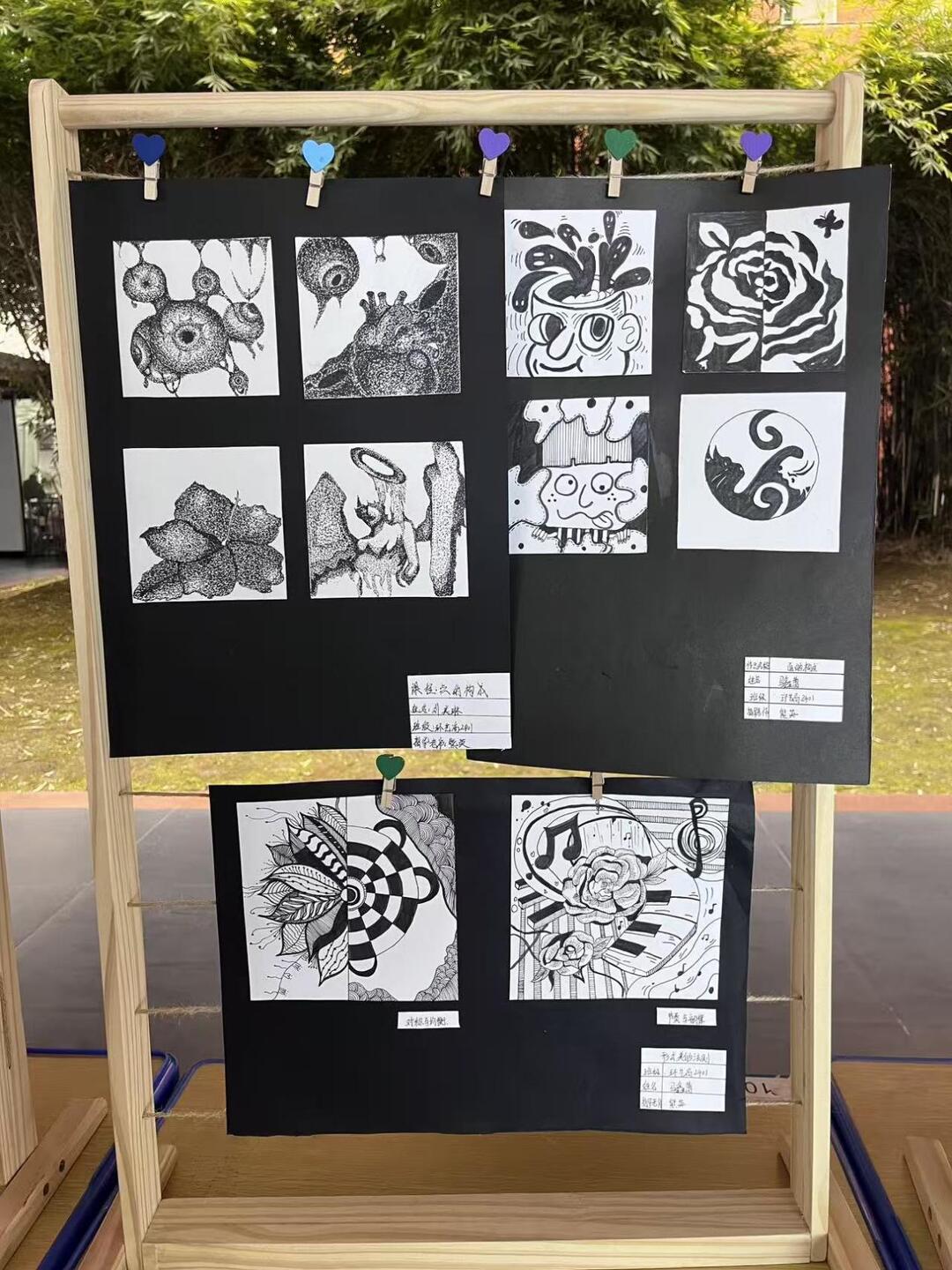 这组黑白装饰画作业,是校园艺术展中极具张力的视觉表达。蝴蝶、花卉在方格画纸里被赋予奇幻纹理,螺旋线条构成的视错觉图案,将平面纸页揉出立体的漩涡感。点线面的交错、黑白灰的层次,让简单的纹样生出无限想象,玫瑰的轮廓在线条缠绕中更显柔美,蝴蝶的翅翼因几何纹路添了科幻感。每一张画纸都是创作者的灵感画布,少年人用画笔打破常规,让黑白线条跳出单调,在校园的展架上织就了一场创意十足的视觉盛宴。