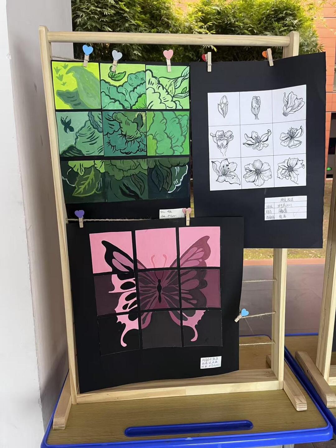 这组色彩构成作业,把自然意象揉进了几何拼接的巧思里。绿色调的花卉拼贴画,以深浅不一的绿块勾勒花瓣脉络,粉色蝴蝶被分割在九宫格中,渐变的粉紫让蝶翅似在光影里颤动,蓝色蝴蝶拼贴则用冷调层次营造出静谧的美感。旁侧的线描花卉稿,又为色彩作品做了细腻的铺垫。普通的画纸与颜料,在创作者手中化作兼具秩序与浪漫的艺术,让自然的诗意与构成的美学相融,成为校园展台上一抹鲜活的色彩风景。