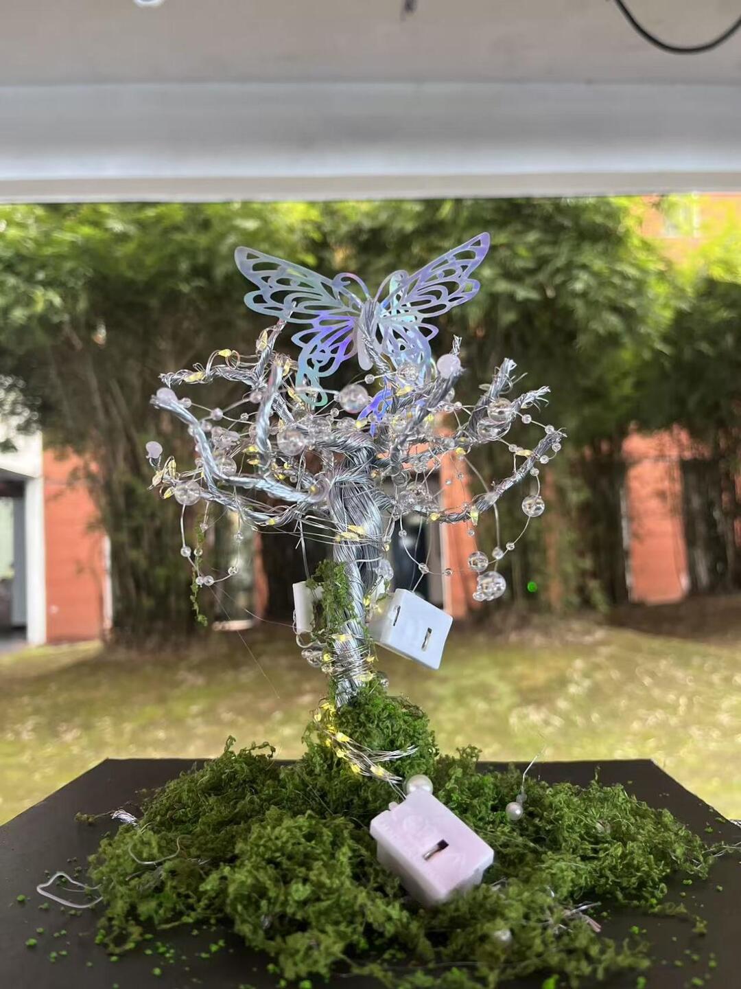 这株手工树艺装置,是校园科创与美学的奇妙碰撞。银色枝干缠绕着LED灯串,顶端一只炫彩蝴蝶展翅欲飞,剪裁的枝叶间,垂落着水晶般的装饰珠。树下铺展着鲜绿苔藓,粉色小灯座与电源接口的“未完成感”,反倒成了作品最真实的注脚——科技与自然在此共生,冷硬的金属与柔软的苔藓对话,让这株“未来之树”既闪耀着工业美学的锋芒,又透着少年人对自然的赤诚向往,在校园展厅中独树一帜。