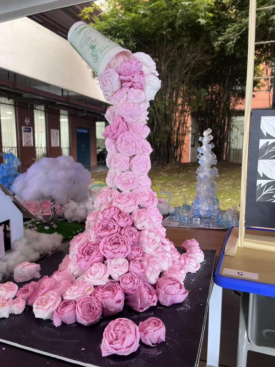 这架粉色花秋千手作,是藏在校园里的浪漫童话。粉玫瑰沿着木架攀绕成花瀑,麻绳系着的秋千板轻晃,蝴蝶摆件似要振翅飞起,棉絮铺就的底座像蓬松的云朵,苔藓又添了几分森系温柔。普通的纹理纸、木杆、羽毛,在创作者的指尖被赋予了生命力,每一处褶皱的花瓣、每一只点缀的蝴蝶,都藏着巧思与热爱。它不仅是一件作业,更是少年人用想象力编织的,独属于校园的美好梦境。