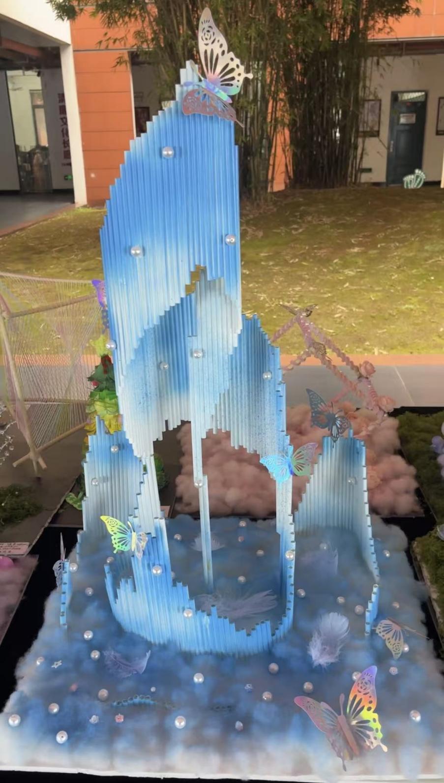 这件蓝色立体手作,是校园手工展里的一方冰蓝梦境。数不清的蓝色吸管层层堆叠,渐变的蓝调如冰川消融的层次,珍珠似碎冰般嵌在杆间,顶端的蝴蝶摆件振翅,仿佛栖于冰山之巅。底座铺着淡蓝棉絮,像翻涌的云海,彩色蝴蝶散落其间,为冷冽的蓝调添了几分灵动。普通的吸管、棉絮与珍珠,在创作者手中化作极具视觉冲击的艺术装置,每一根杆件的排列都藏着巧思,让校园手工作业跳出平淡,凝成了触手可及的梦幻秘境。