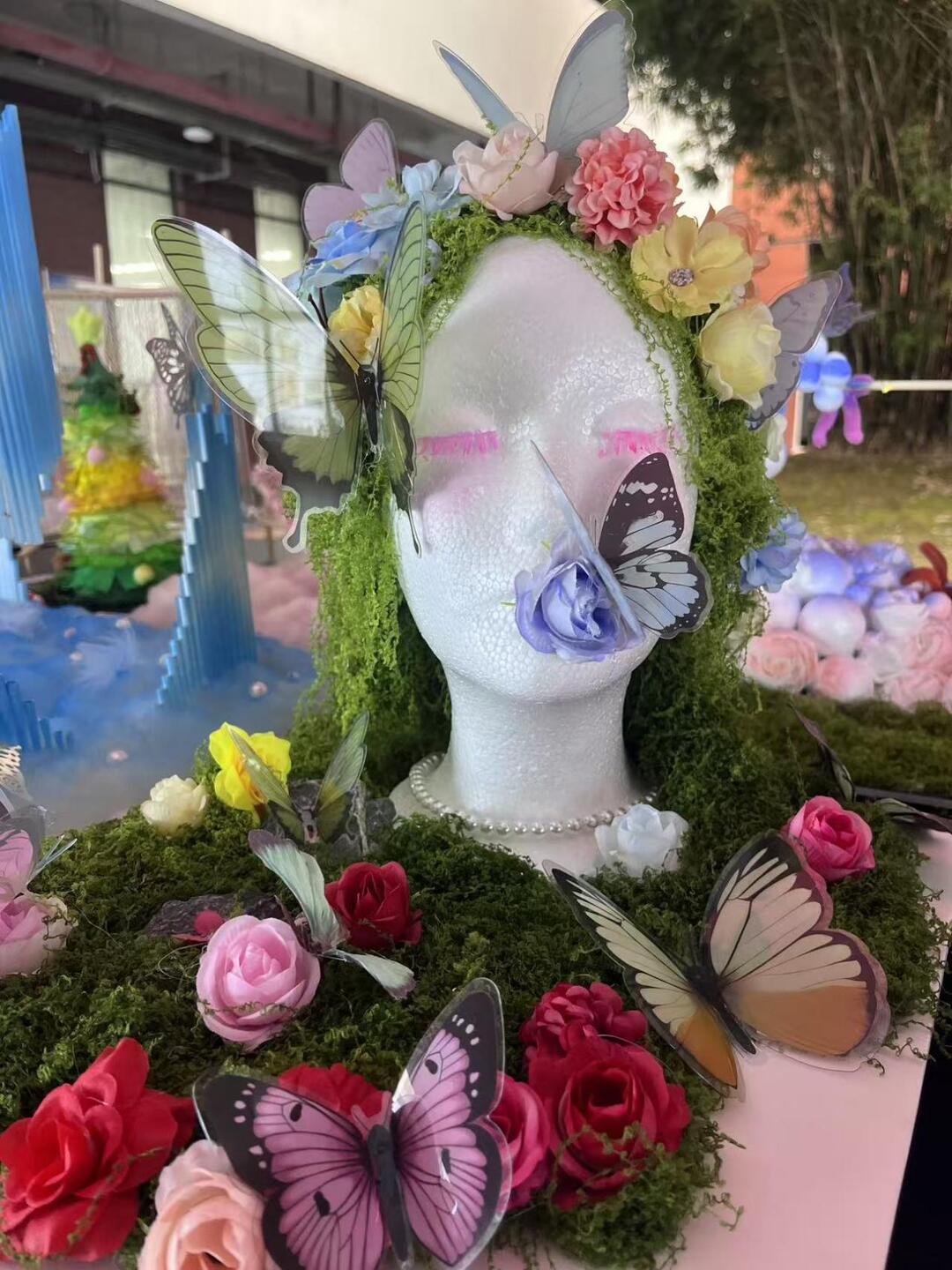 这座头戴花艺的人体模型,是校园手工展中最灵动的存在。苔藓铺就的“长发”垂落肩头,各色玫瑰与蝴蝶标本点缀其间,粉紫睫毛化作“眼眸”,珍珠项链衬得颈间愈发精致。背景中蓝色城堡与粉色花堆交相辉映,让整个装置宛如森林精灵的觉醒仪式。普通的模型头、人造花材,在创作者手中幻化成充满生命力的艺术,每一片花瓣、每一只蝶翅都传递着对自然之美的极致追求,成为展厅里令人驻足的浪漫焦点。