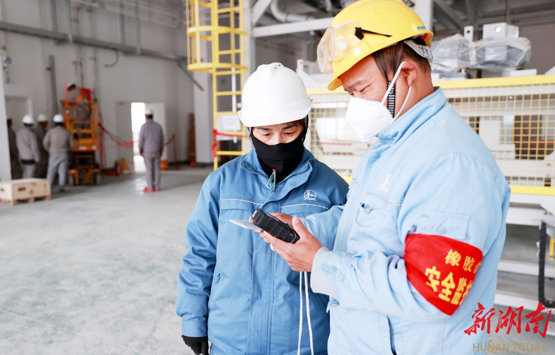 1月4日,湖南石化橡胶部SBS片区包装线和仓库升级工程现场,该部员工陈杨辉和承包商人员一同进行安全监护。