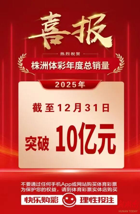 近日,株洲市体育彩票销售工作传来喜讯:截至2025年12月31日,全市体育彩票年度总销量达到10.04亿元,首次突破十亿元大关,实现历史性跨越。