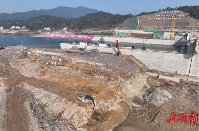 (1月6日,金塘冲水库枢纽工程施工现场机器轰鸣。湖南日报全媒体记者 傅聪摄)
