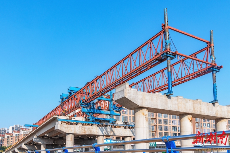 1月6日,东安县官田路与湘桂铁路“平改立”施工现场,工人在进行上跨桥梁箱梁架设施工作业。该项目是东安县重点民生工程,主线按照城市主干路标准进行建设,桥梁全长280米,宽16米,主线同时采用分离式立交跨越现状舜皇大道。项目建成后,将结束县城道路与湘桂铁路平交的历史,对于提高铁路行车安全,解决县城交通堵点,促进区域经济发展具有重要意义。蔡小平 摄(湖南图片库)