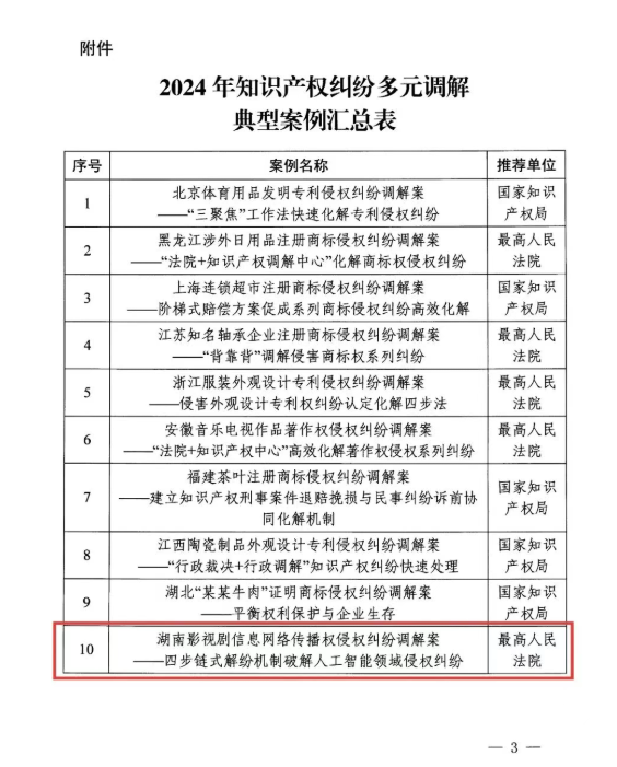 近日,国家知识产权局办公室和最高人民法院办公厅联合发布2024年知识产权纠纷多元调解十大典型案例。其中,湖南法院审理的"湖南影视剧信息网络传播权侵权纠纷调解案四步链式解纷机制破解人工智能领域侵权纠纷"成功入选,该案也是此次最高人民法院推荐并入选的5件知识产权案件之一。