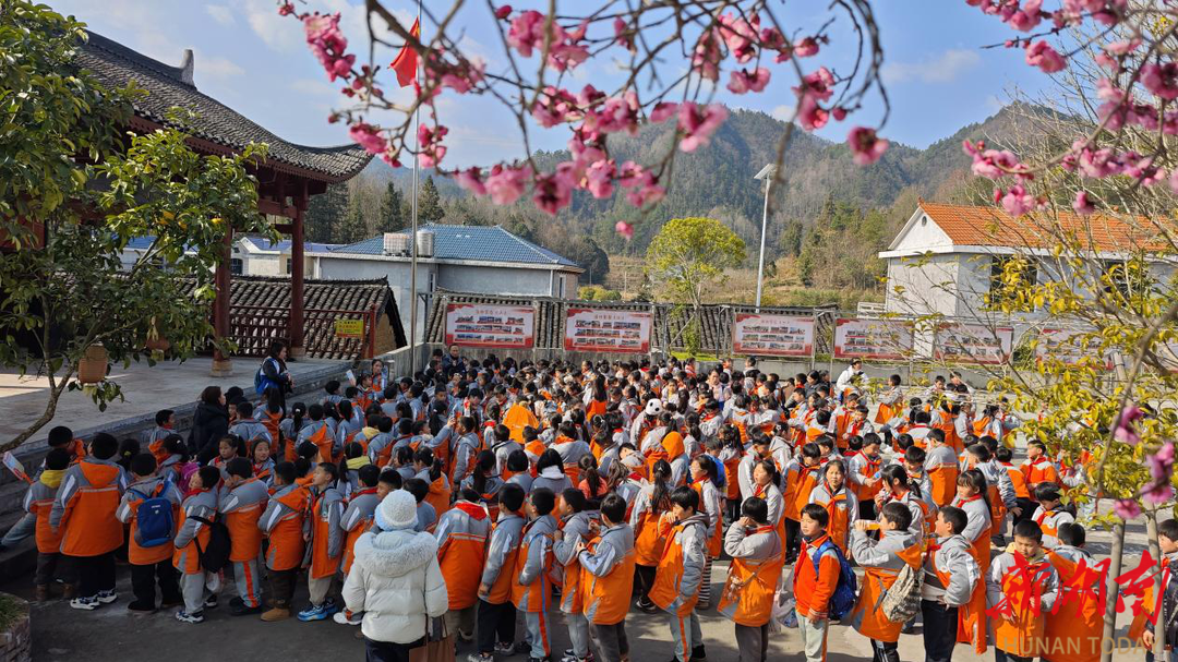 冬日暖阳洒满苗乡,园内梅花吐蕊,人气旺盛,来自凤凰县芙蓉学校的240名学子有序参与丰富多彩的研学活动中。在农具展示区,打谷机、蓑衣、斗笠、犁耙等传统农具整齐排列,讲解员生动讲述着每一件农具的用途和背后的农耕故事,孩子们围在打谷机旁,轮流体验打谷机的乐趣,清脆的机器声响与稚嫩的欢呼声交织,切身感受着先辈们的农耕智慧。