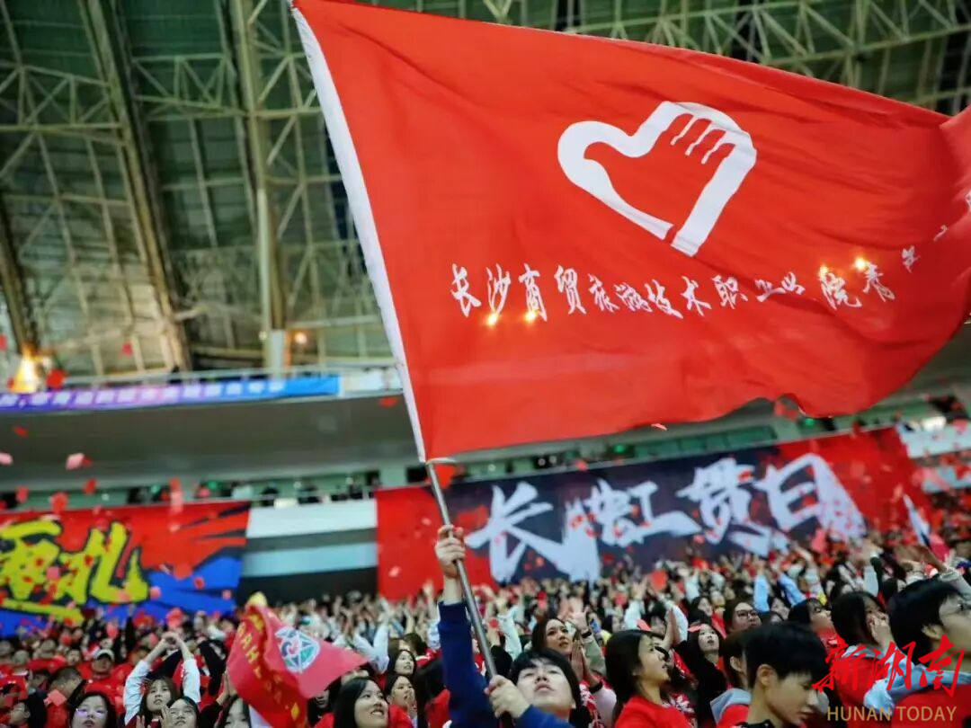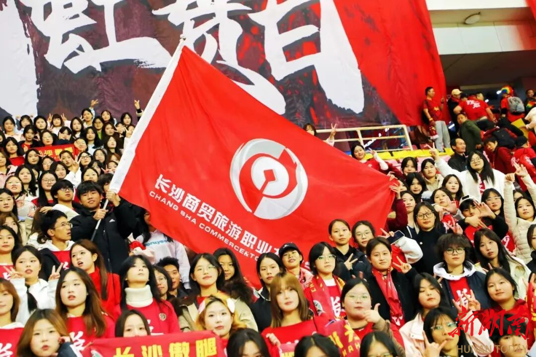 “热血燃胸膛,战鼓阵阵惊雷响……”湘超半决赛长沙对阵永州的现场,由数百名商贸学子组成的助威方阵摇旗呐喊,看台上席卷过一阵阵红色声浪。