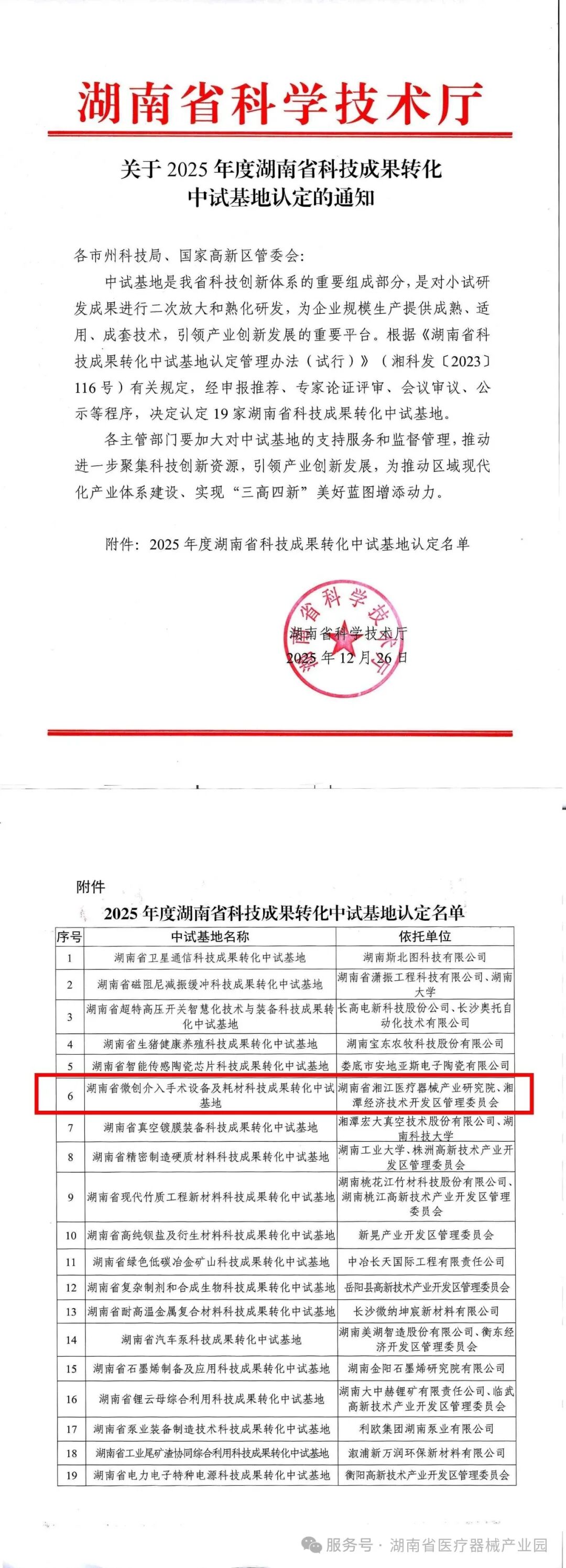 近日,省科技厅关于2025年湖南省科技成果中试基地认定名单的公示结束,由湖南省湘江医疗器械产业研究院牵头,联合华芯医疗、善彤医疗共同申报的湖南省微创介入手术设备及耗材科技成果转化中试基地成功获批。