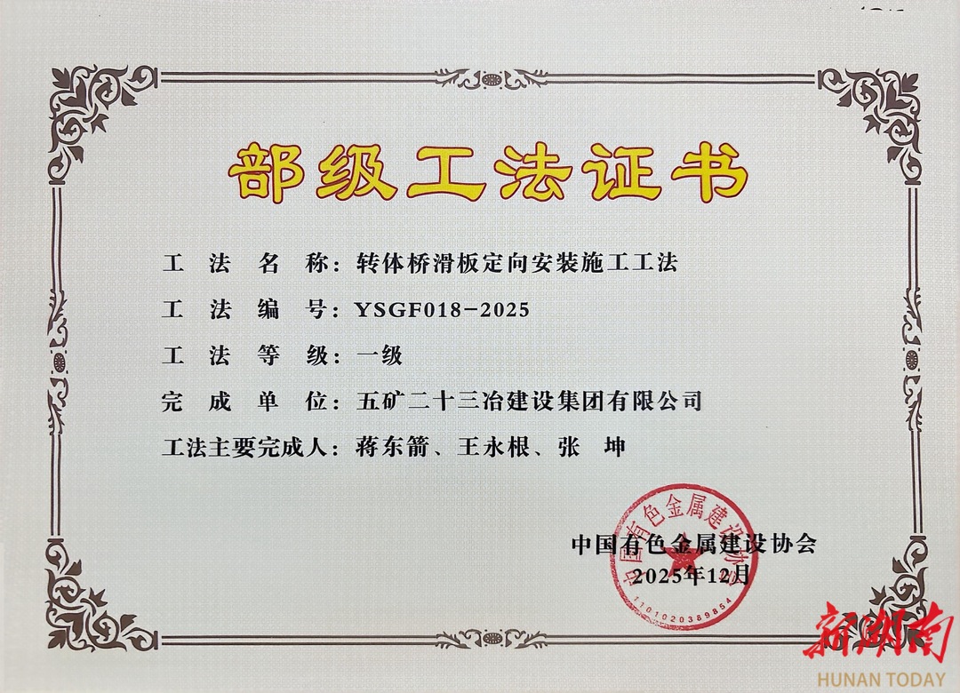 新湖南客户端1月8日讯(通讯员 戴丽)近日,中国有色金属建设协会公布2025年度工法评审结果。五矿二十三冶建设集团有限公司(以下简称“五矿二十三冶”)2025年累计获评省部级工法达112项,数量创下历年新高,彰显了该企业在施工技术研发与创新应用方面的强劲实力。