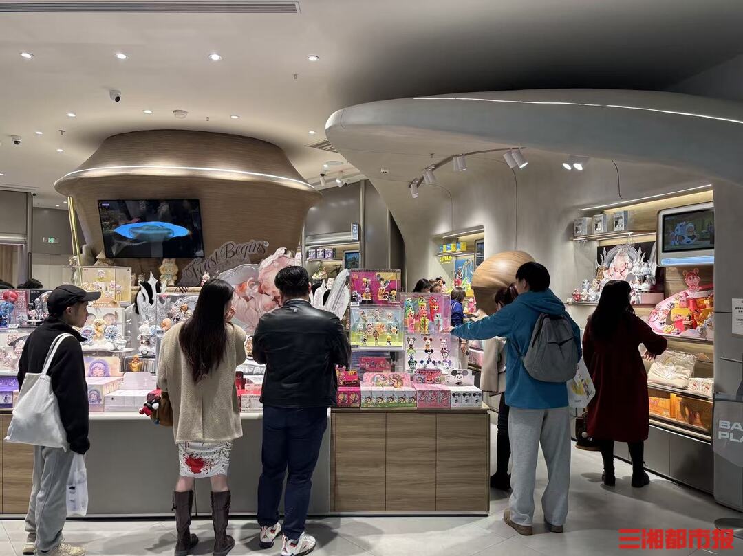 1月7日晚,临近22时闭店时段,长沙万象城一楼入口处的盲盒售卖区依旧人头攒动。此起彼伏的摇盒声中,不少消费者正专注挑选心仪款式,而新品陈列区也围满了等候补盒的顾客。