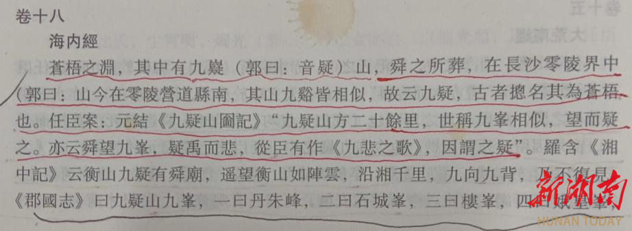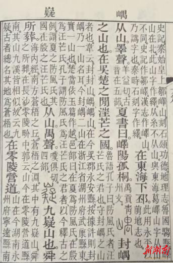 正是由于上述原因,东汉许慎《说文》对“嶷”字的释文是:“嶷,九疑山也,舜所葬,在零陵营道。”(见下图)营道县始置于西汉元鼎六年(前111),县治在今宁远县天堂镇大阳洞村,位于九疑山北麓。从许慎对“嶷”字的释文看,“嶷”就是专指九疑山,或者说“嶷”是九疑山的专称。在许慎对“嶷”字的本义作出解释以后,历代文史界达成一道不成文的默契,即为了避免行文上的混乱与误解,九疑之疑,一律不带山字头。这就是魏晋以后至明代以前,我们所能见到古代文献中,凡是有九疑或九疑山的地方,疑字均不带山字头。但是,在引用东汉以前的文献时,原文为“九嶷”或“九嶷山”者,则予以保留。这也是清乾隆武英殿本《二十四史》中的《前汉书·武帝本纪》中,以及清光绪初年由浙江书局辑刊的《二十二子》中的《山海经·海内南经》中,仍然使用带山字头的“九嶷”或“九嶷山”的根本原因。而毛主席知识渊博,博览群书,四书五经、诸子百家、二十四史等古代文献,无不在他的阅读范围之内。毛主席在《七律·答友人》中采用带山字头的九嶷山,则是依据《山海经·海内南经》和《前汉书·武帝本纪》中的九嶷山写法,并非毛主席创造出来的一个生僻字,仅此而已。