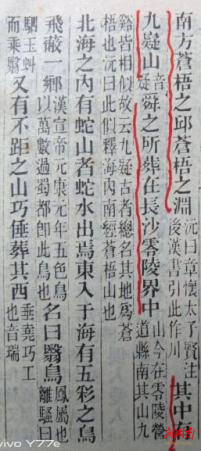 须知,明清时期特别是清中期,是考据学盛行的时期。考据学是一种治学方法,又称为考证学或朴学,主要的工作是对古籍加以整理、校勘、注疏、辑佚等。它始于明中后期,盛于清前中期,延于清末民国初期。因此,无论是《二十二子》,还是《二十五史》,其所依据的版本,都是经过严格考证、准确无误的。如《二十二子》中的《山海经》,所据版本为晋郭璞的《山海经注》,并经清毕沅校核。而郭璞《山海经注》所依据的《山海经》,是现存最早的《山海经》。郭璞是晋代著名地理学家。如果《山海经·海内南经》“其中有九嶷山”的“嶷”字不带山字头,郭璞断然不可能将“九嶷山”之“嶷”加上一个山字头。而清代毕源作为一个著名考据学家,如果郭璞《山海经注》中“九嶷山”之“嶷”没有山字头,他也不可能无中生有,擅自加上一个山字头。因此,我们可以推定,郭璞《山海经注》所依据的《山海经》版本中,“九嶷山”之“嶷”,本来就是带山字头的(见下图)。无独有偶,清吴任臣《山海经广注》中的“九嶷山”之“嶷”,也是带山字头的(见右下图)。这决不是偶然,一定是吴任臣所依据的《山海经》版本,本来就是带山字头的“嶷”。同理,《二十五史》中的《二十四史》,所依据的版本是清乾隆四年(1739)武英殿本,其中班固《前汉书》所依据的版本是唐代颜 师古作注的版本。如果在班固之前,九嶷山之“嶷”没有加山字头的写法,班固不可能就擅自造了一个带山字头的“嶷”字而写成“九嶷山”。据此,我们完全可以推定,在《前汉书·武帝本纪》中,班固可能是依据《山海经》,将汉武帝“望祀虞帝于九嶷”中,写成了带山字头的“九嶷”。上述这些完全可以说明,带山字头的“嶷”字,决不是毛主席创造出来的,而是在东汉班固以前就已经存在。不仅如此,不仅东汉以前带山字头的“九嶷”已经存在,而且是与“九疑”通用或混用的。