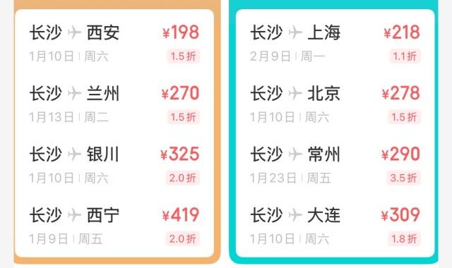 湖南日报1月8日讯(全媒体记者 于淼)1月8日,记者查询多家航司与旅行平台发现,元旦假期后国内多条航线机票价格“大跳水”,一些航线机票价格低至1折。当前从长沙出发至西安、厦门、上海等地,机票只需200元左右(不含税),叠加1月5日起下调的国内航线燃油附加费,近期是错峰出游的好时机。