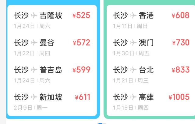 记者在购票网站查询到,本月从长沙出发,较多航线都有特价折扣。国内航线方面,至杭州195元,至西安198元,至重庆228元,至南京243元,至上海255元;国际航线方面,至曼谷511元,至吉隆坡525元,至普吉岛599元,至新加坡629元,至首尔710元,至清迈719元,至巴厘岛792元。