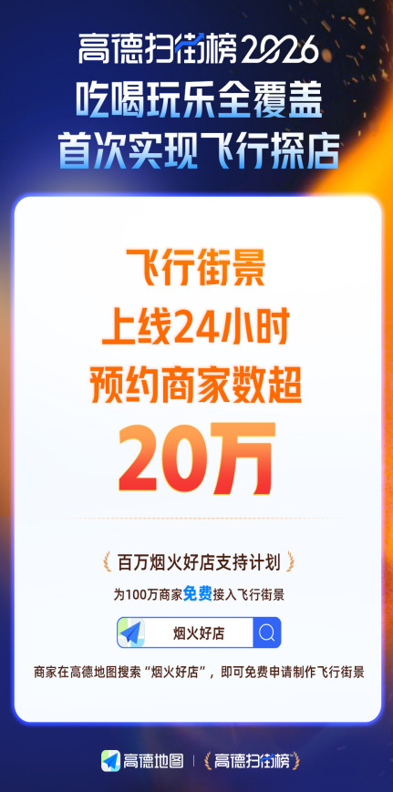 湖南日报1月8日讯(全媒体记者 邹靖方)1月7日,全面升级的高德扫街榜2026发布,同步启动“百万烟火好店支持计划”,为100万商家免费接入“飞行街景”。记者今天从高德获悉,该计划发布仅24小时,报名预约的商家数就已超过20万。