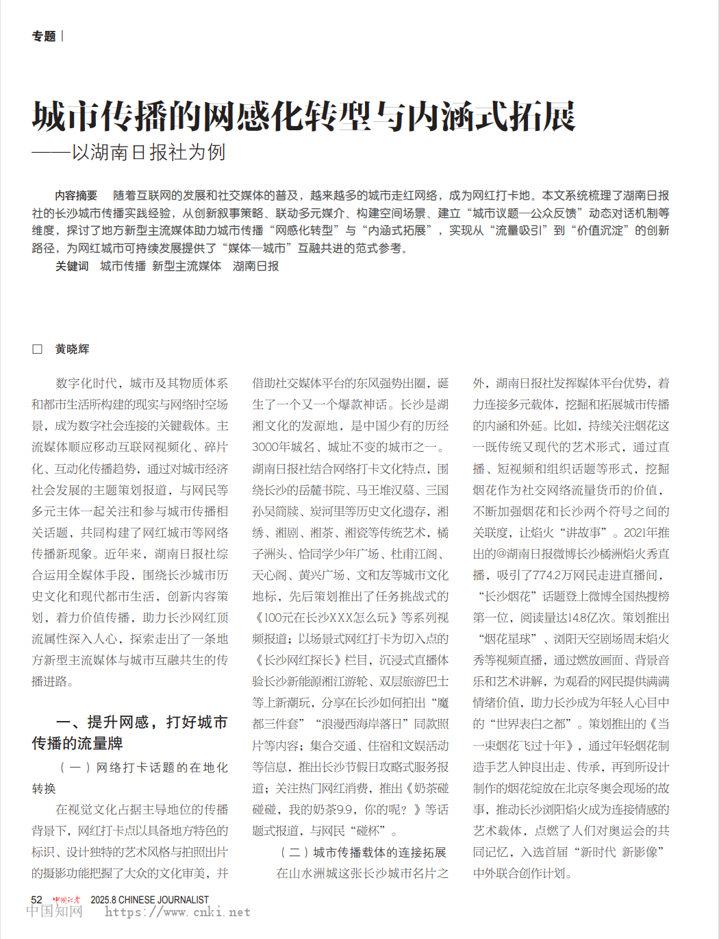 数字化时代,城市及其物质体系和都市生活所构建的现实与网络时空场景,成为数字社会连接的关键载体。主流媒体顺应移动互联网视频化、碎片化、互动化传播趋势,通过对城市经济社会发展的主题策划报道,与网民等多元主体一起关注和参与城市传播相关话题,共同构建了网红城市等网络传播新现象。近年来,湖南日报社综合运用全媒体手段,围绕长沙城市历史文化和现代都市生活,创新内容策划,着力价值传播,助力长沙网红顶流属性深入人心,探索走出了一条地方新型主流媒体与城市互融共生的传播进路。