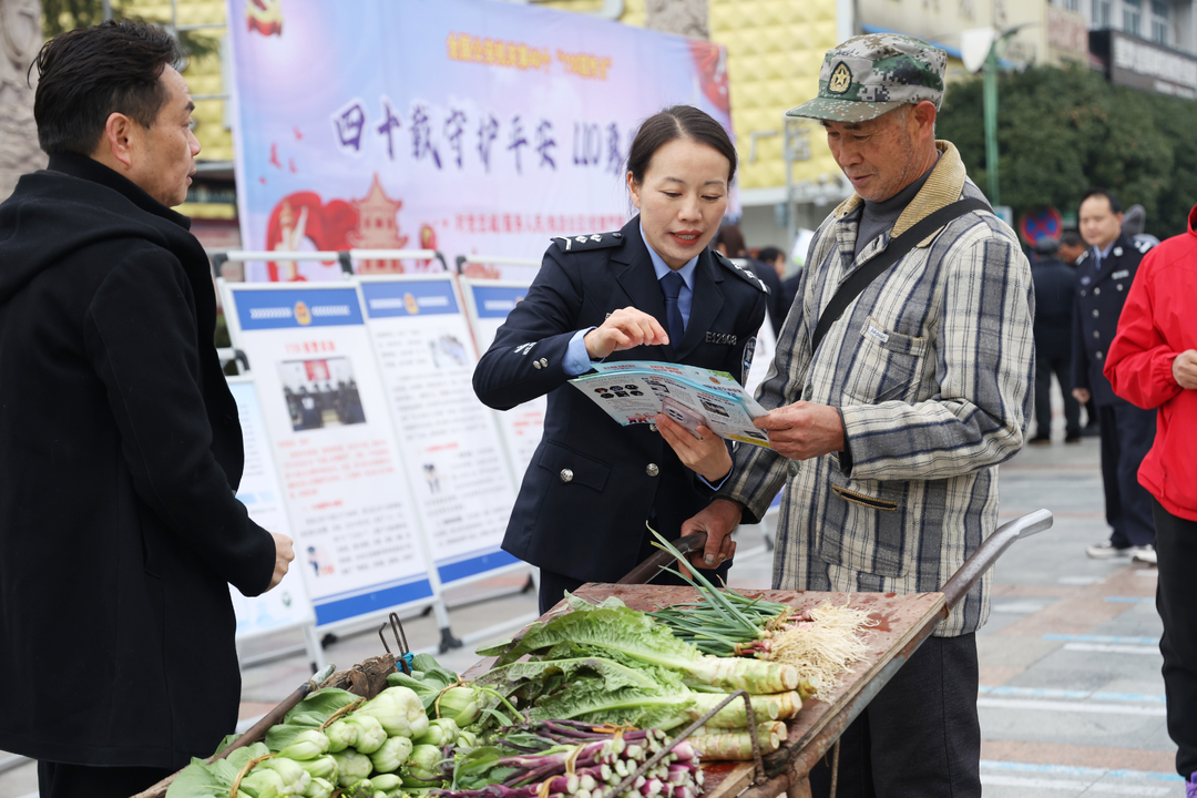 随后,局党委班子一行人员还与部分民、辅警一道,在雪峰广场开展“四十载守护平安 110勇毅前行”为主题的集中宣传活动。通过发放宣传资料、现场讲解、现场答题等形式,工作人员向群众广泛宣传110 报警服务台的职能作用、报警方式、注意事项等内容,引导群众正确使用110报警电话。同时,开展了反诈、交通安全、禁毒、反恐、网络安全知识及相关法律法规的宣传,切实提高了群众自我防护能力,增强安全防范意识,引导群众通过法治渠道解决矛盾纠纷。