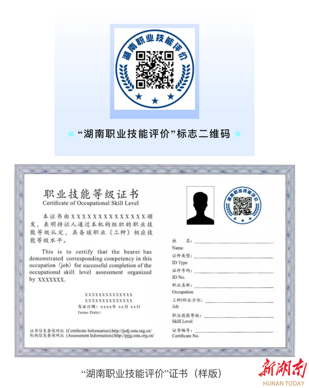 由具备资质的社会培训评价负责考务组织与证书核发,通过人员将获得带有“湖南职业技能评价”标志的等级证书,可扫描证书二维码或登录技能人才评价工作网(http://pjjg.osta.org.cn/)查询真伪。