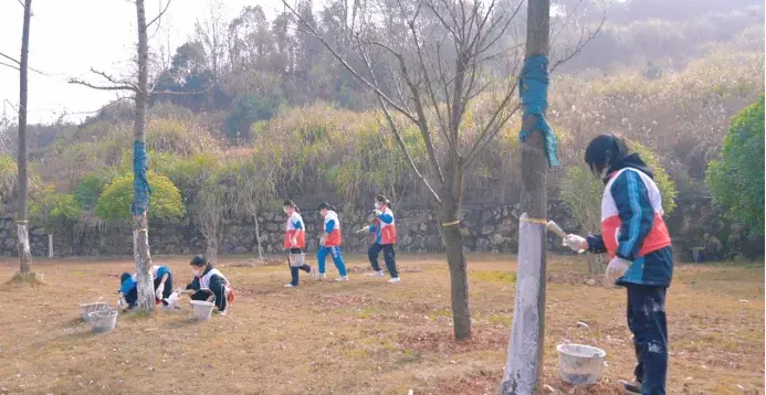 活动前,生物教师李姣贤为学生们讲解了树木涂白的科学作用:涂料可消灭越冬虫卵和病菌,反射阳光以降低树干昼夜温差,防止开裂。值得一提的是,本次使用的涂白剂由师生共同调制——在石灰粉基础上,加入硫磺、除虫剂及颜料,调制成兼具防护与美观的乳黄色涂料,还能在夜间反光起到安全提示作用。