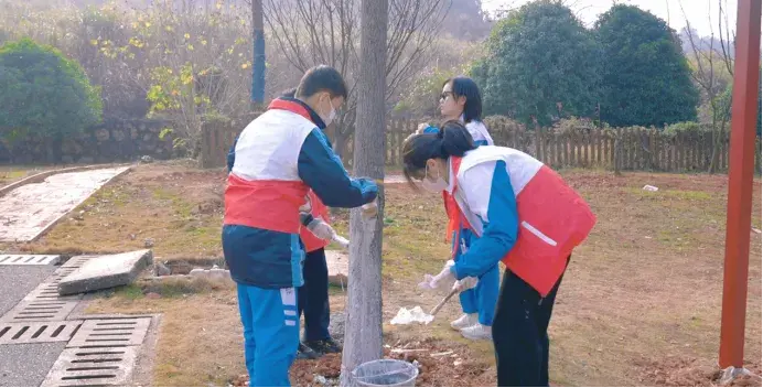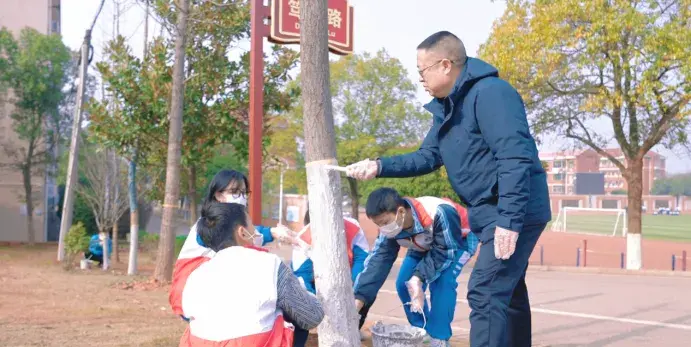 在教师指导下,学生们分组协作,细致涂抹树干底部。尽管涂料沾上衣袖,大家仍干劲十足。“看着树木穿上‘新衣’,心里特别有成就感!”2502班学生李知霖说。2505班彭缨涵也表示:“能参与保护校园树木,非常骄傲。”