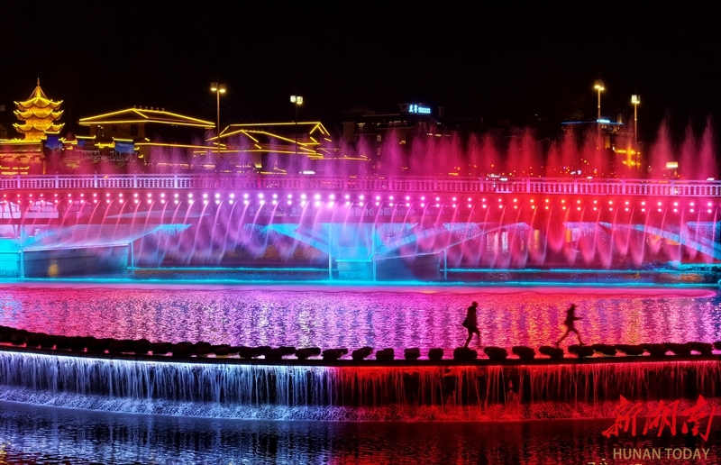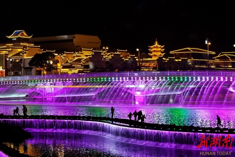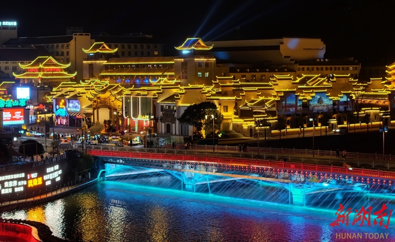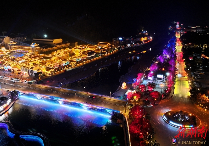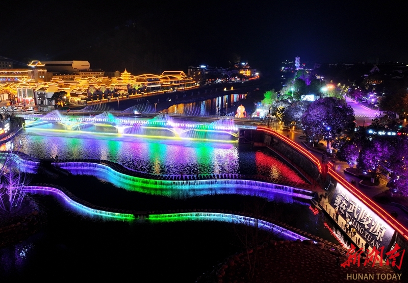 1月10日晚,张家界市武陵源区索溪河沿岸灯光璀璨,水影交融,构成一幅流动的光影画卷。当地围绕索溪河打造多元夜间文旅消费新业态,让“夜游武陵源”变得更加精彩。吴勇兵 摄(湖南图片库)