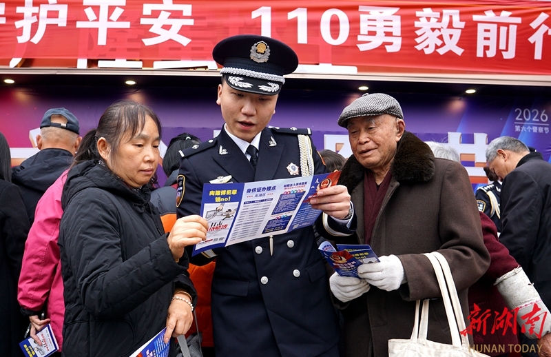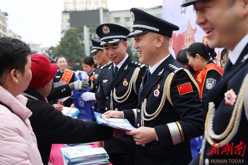 1月10日,郴州市公安局北湖分局民警向市民发放宣传手册。当天,各地举办形式多样的活动,庆祝第六个中国人民警察节。李加诺 摄(湖南图片库)