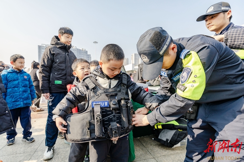 1月10日,吉首市“ 警彩吉首·平安共建”警营开放日暨岁末年初集中宣防活动现场,民警为小朋友介绍警用装备。当天,各地举办形式多样的活动,庆祝第六个中国人民警察节。彭璟 摄(湖南图片库)