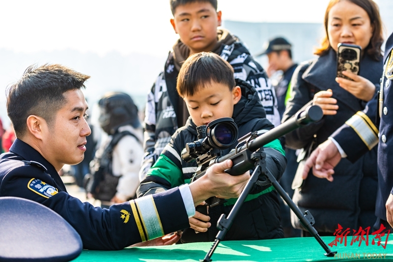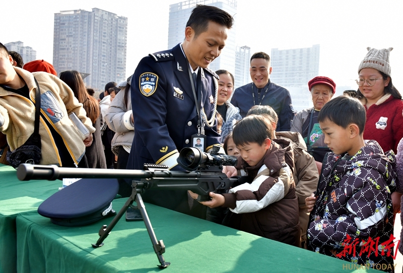 1月10日,吉首市“ 警彩吉首·平安共建”警营开放日暨岁末年初集中宣防活动现场,小朋友在民警的指导下体验警用武器。当天,各地举办形式多样的活动,庆祝第六个中国人民警察节。刘丹 姚方 摄影报道(湖南图片库)