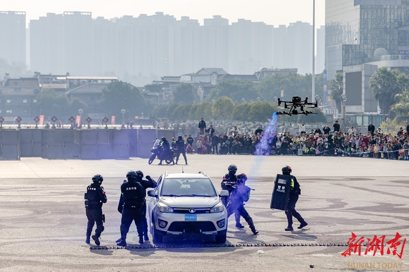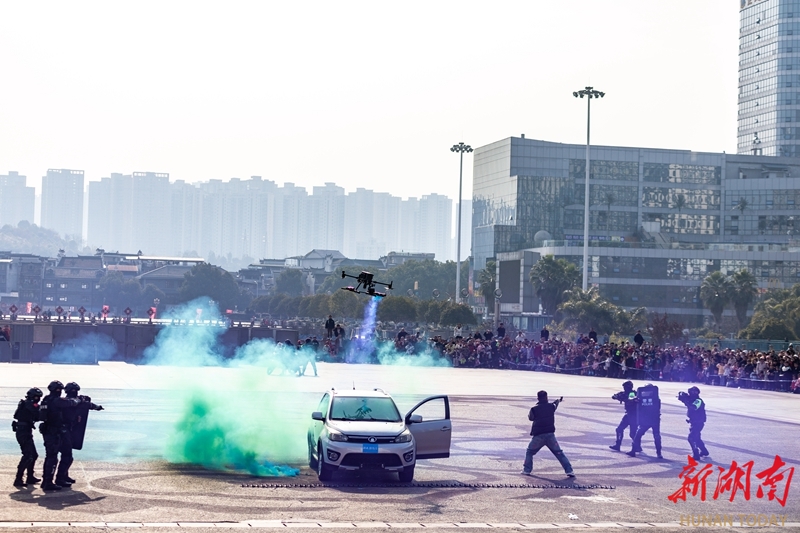1月10日,吉首市“ 警彩吉首·平安共建”警营开放日暨岁末年初集中宣防活动现场,特警向市民演示警务技能。当天,各地举办形式多样的活动,庆祝第六个中国人民警察节。彭璟 摄(湖南图片库)