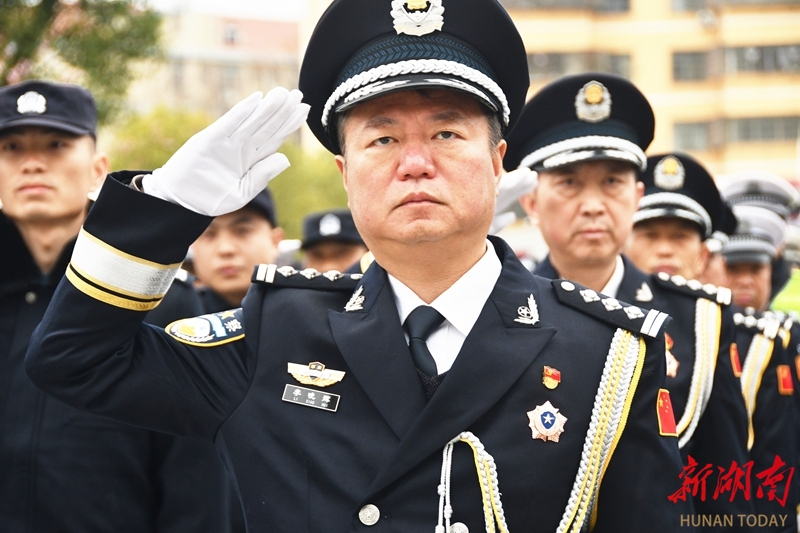 1月10日,江永县公安局,民警向警旗敬礼。当天,各地举办形式多样的活动,庆祝第六个中国人民警察节。田如瑞 摄(湖南图片库)