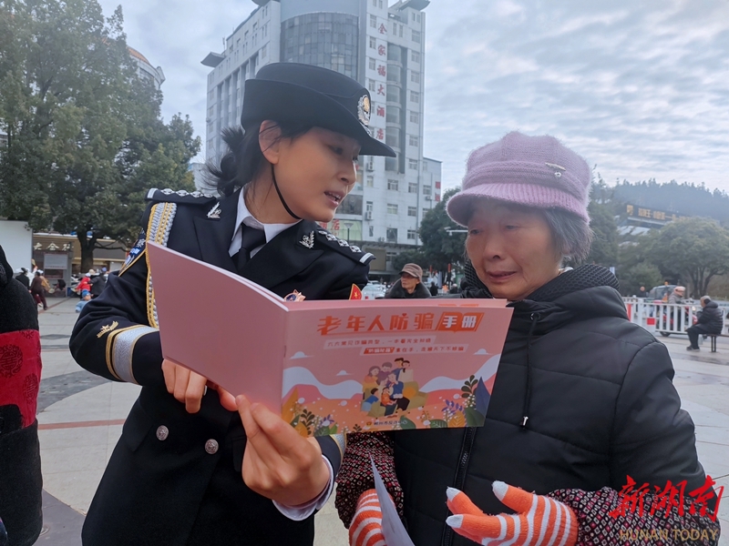 1月10日,桂东县城罗霄广场,民警给市民讲解反诈知识。当天,各地举办形式多样的活动,庆祝第六个中国人民警察节。邓仁湘 摄(湖南图片库)