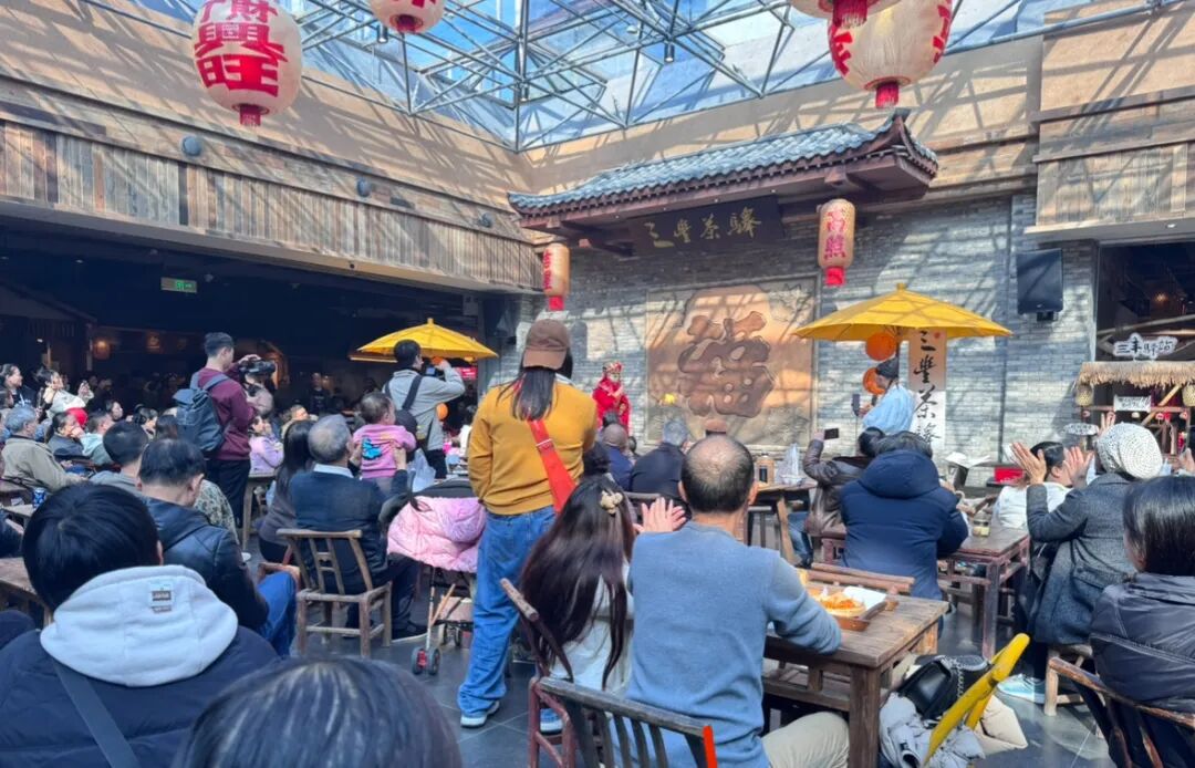 逛得疲惫时,不妨移步至“三丰茶驿”小憩。名为“茶驿”,意在承袭古时驿站休憩交汇之功用,亦成为连接传统茶文化与当代市井生活的纽带。三五好友围炉煮茶,茶香与不远处市集的烟火气相映成趣,定期上演的花鼓戏、皮影戏,让本土文化在此传承。