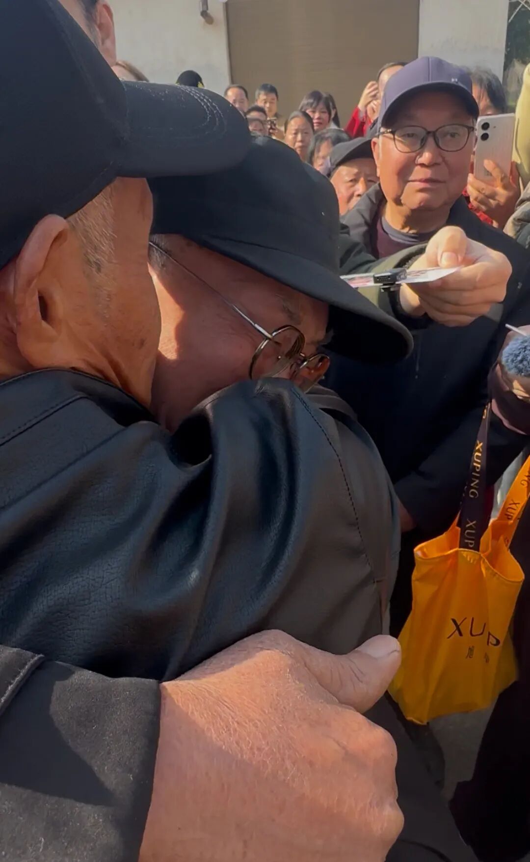 李春喜下车后,在众人的拥簇下往前行走,来到了哥哥们的身旁。李春喜依次与哥哥们相拥,哥哥们流下泪水,紧紧拉着弟弟的手往家的方向走去。李春喜的侄孙女也献上了代表全家人欢迎的大红花。