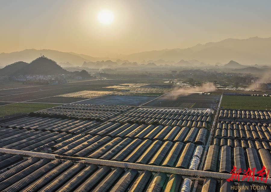 1月11日,道县清塘镇陈熊村,整齐的蔬菜基地、食用菌大棚、成片的高标准农田与村庄、远山相映成景,构成一幅冬日画卷。近年来,该县实施产业富民工程,培植绿色有机蔬菜种植、生态循环种养等特色产业,带动农民增收,助推乡村全面振兴。 蒋克青 摄(湖南图片库)