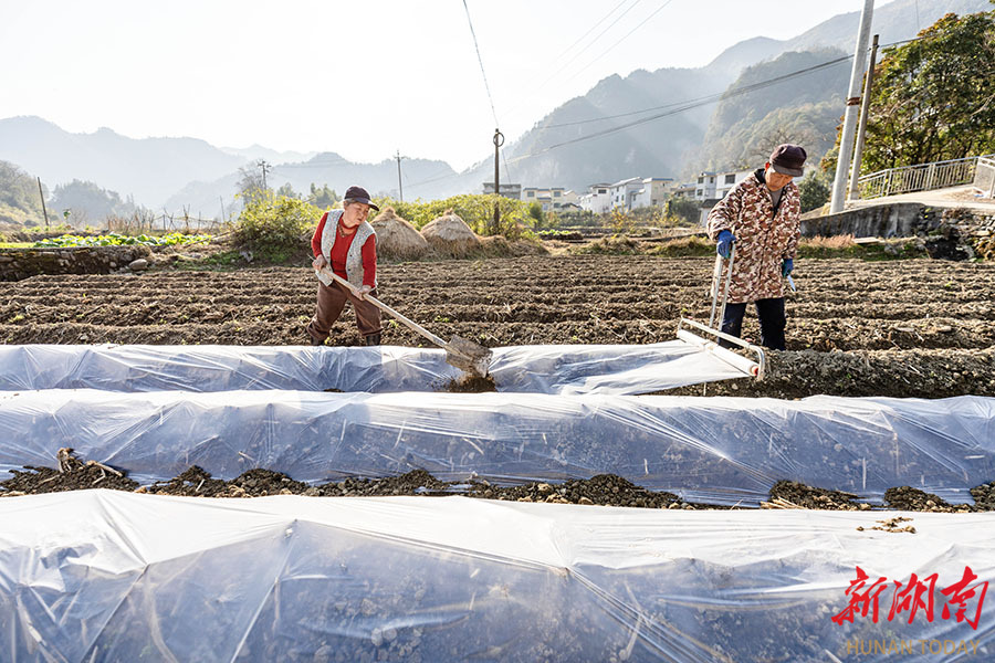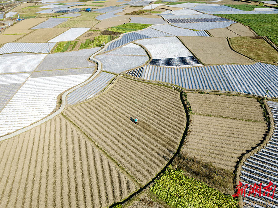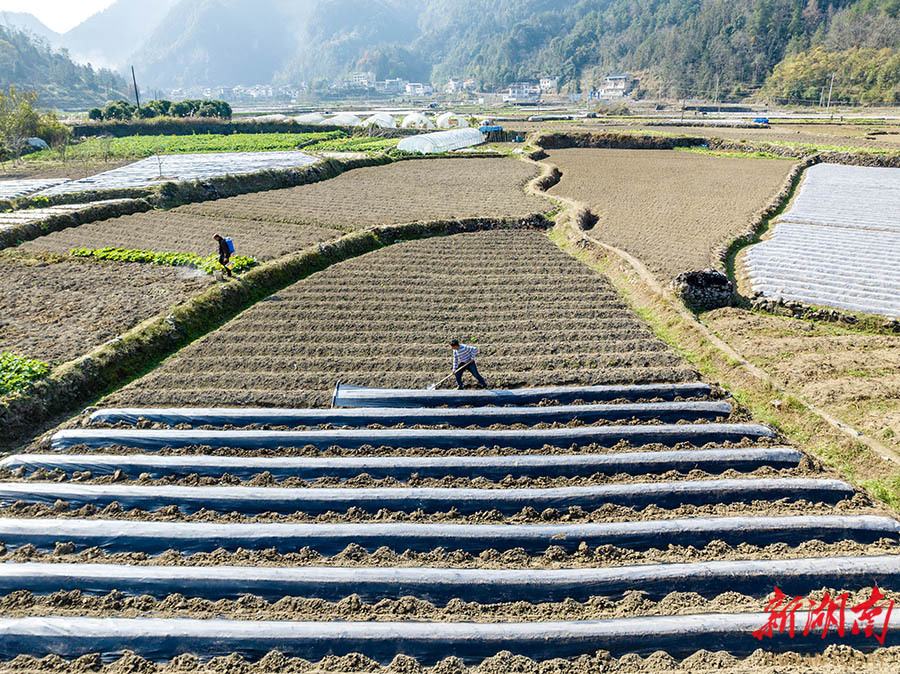 1月11日,吉首市乾州街道西门口村千亩冬马铃薯标准化栽培示范基地,村民在为马铃薯覆盖地膜。时下,该村农民抢抓农时,通过铺设地膜为马铃薯保温防寒,保障冬季作物生长,有效提升冬马铃薯品质与效益,促进增产增收。 彭璟 摄(湖南图片库)