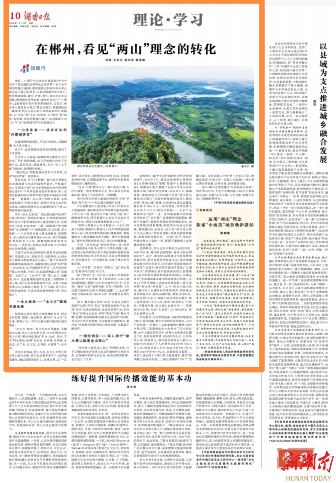 党的二十届四中全会审议通过的《中共中央关于制定国民经济和社会发展第十五个五年规划的建议》强调,要牢固树立和践行绿水青山就是金山银山的理念,以碳达峰碳中和为牵引,协同推进降碳、减污、扩绿、增长,筑牢生态安全屏障,增强绿色发展动能。湖南的南大门——郴州,这座曾因矿而兴的资源型城市,正是以“绿水青山就是金山银山”理念为指引,挥毫描绘出一幅绿水青山与金山银山相得益彰的壮丽画卷。从“生存”到“生态”的转变、从“黑色”到“绿色”的涅槃,其间的智慧与魄力,生动体现于对“山”与“水”的深情守护与价值重估中。