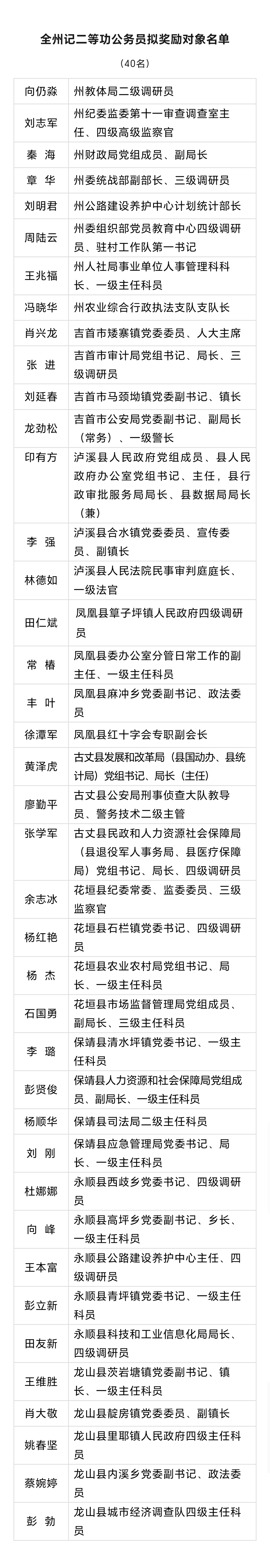 为奖励先进、弘扬正气,激励动员全州广大公务员担当作为、真抓实干,州委、州政府决定给予一批公务员和公务员集体记二等功奖励。在自下而上推荐、广泛征求意见、深入考察了解、集体研究决定的基础上,经报州委、州政府同意,确定了40名公务员和18个公务员集体为拟奖励对象。