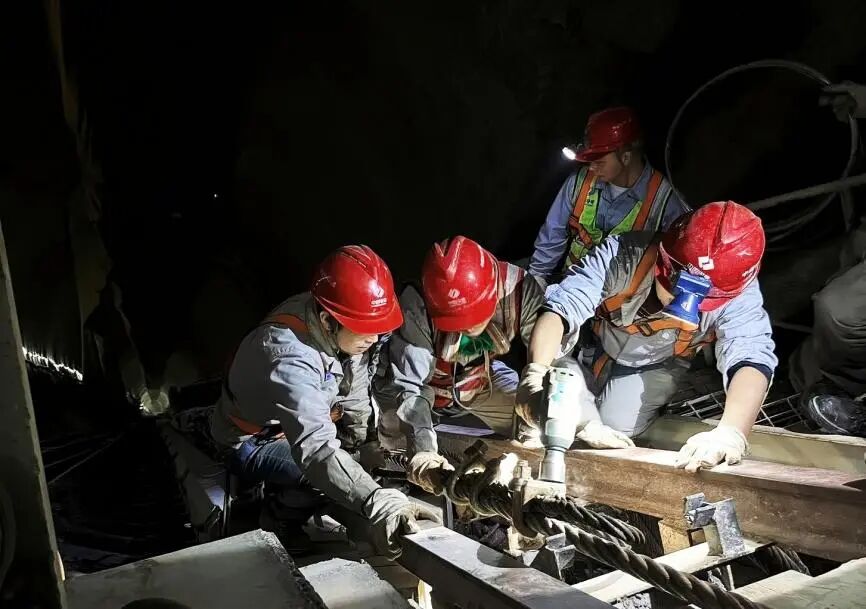 全球首台大倾角可变径TBM“天岳号”团队成员俯身实干、精准操作,全力确保引水斜井延伸材料的安全拆除。