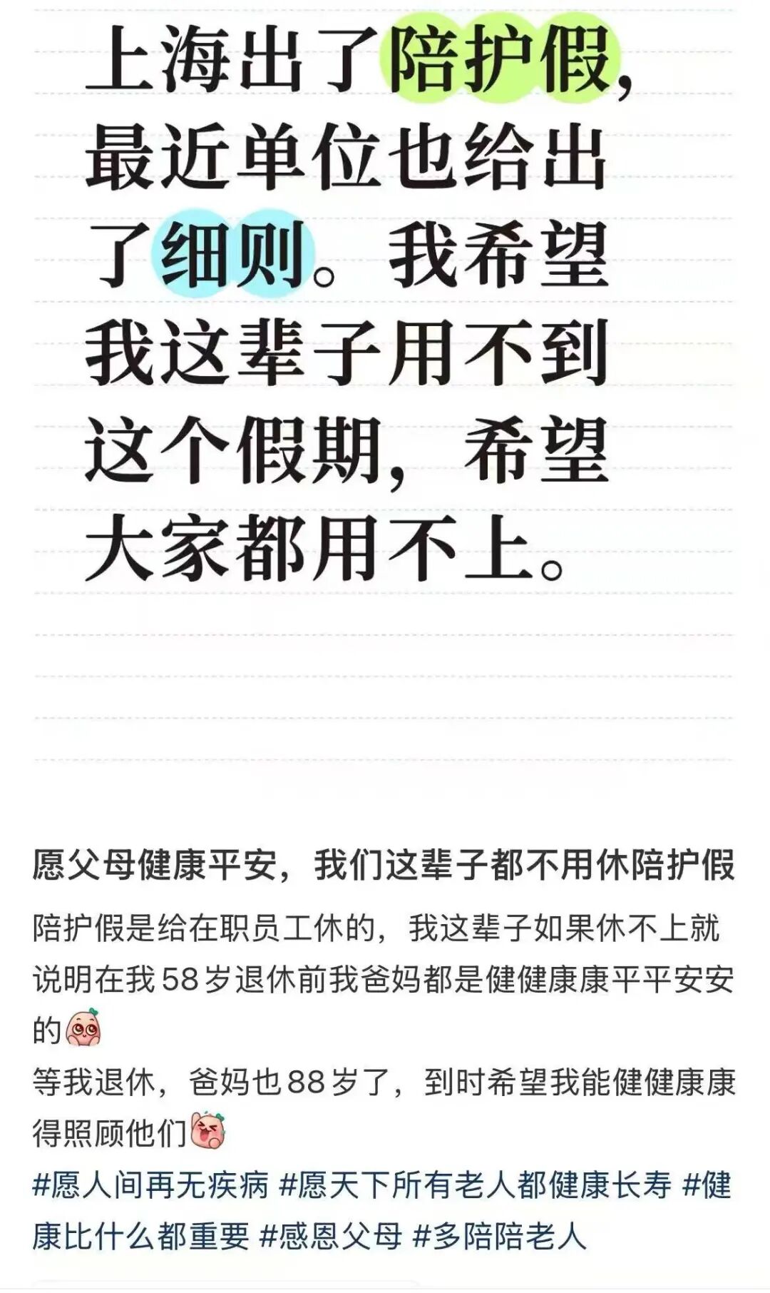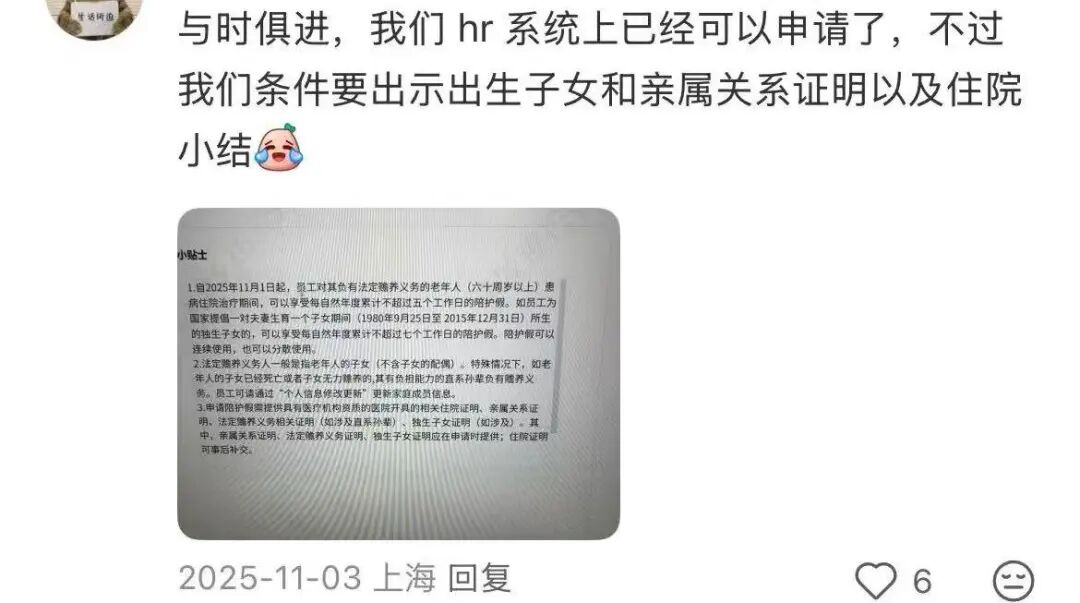 调查中,记者在网上看到一条高赞评论,身为子女,谁都不会主动想要“陪护假”,但真的遇到了,希望不要再让大家糟心地“请假”“投诉”,这个时候只希望能安心陪伴在父母身边。