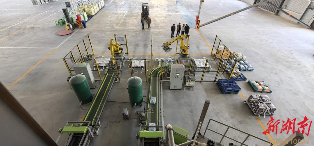 产业项目的强势突围,成为桃江发展的核心引擎。1月9日,笔者在湖南玖固复合材料有限公司生产车间看到,原料经精准计量、立体搅拌、严格质检后,通过自动灌装线与智能机械臂完成码垛覆膜,全程自动化流程高效运转。