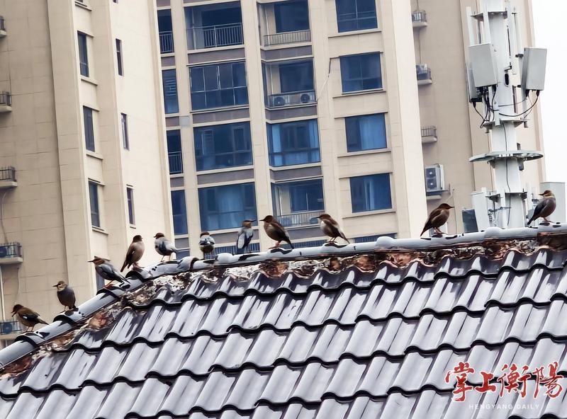 这些结伴而来的鸟儿飞到城市楼顶?所为何事?衡南县江口鸟洲管理所陈俊仔细辨认记者拍摄的图片后,确认这些“客人”正是前来衡阳越冬的冬候鸟灰椋鸟,上体灰褐色,嘴喙点缀着亮眼的橙红色,生性喜爱集群活动,胆量较大,秋冬季主要以植物果实和种子为食。陈俊解释道,时值周末,人为干扰相对较少,办公楼平整的屋顶便于停歇观察。这群灰椋鸟飞临城市,主要目的就是“找吃的”,为漫长的越冬期储备能量。集群出动少则几十只,多时成千上万,阵势颇为壮观。近年来,这种“排排站”的生动场景在城市中越来越常见,正是城市林木繁茂、生态环境持续向好的直观印证。市民家门口的“鸟类朋友圈”正越来越大,待到春暖花开时,这些鸟儿又将迁至北方繁殖。(文/图 全媒体记者胡亚华)