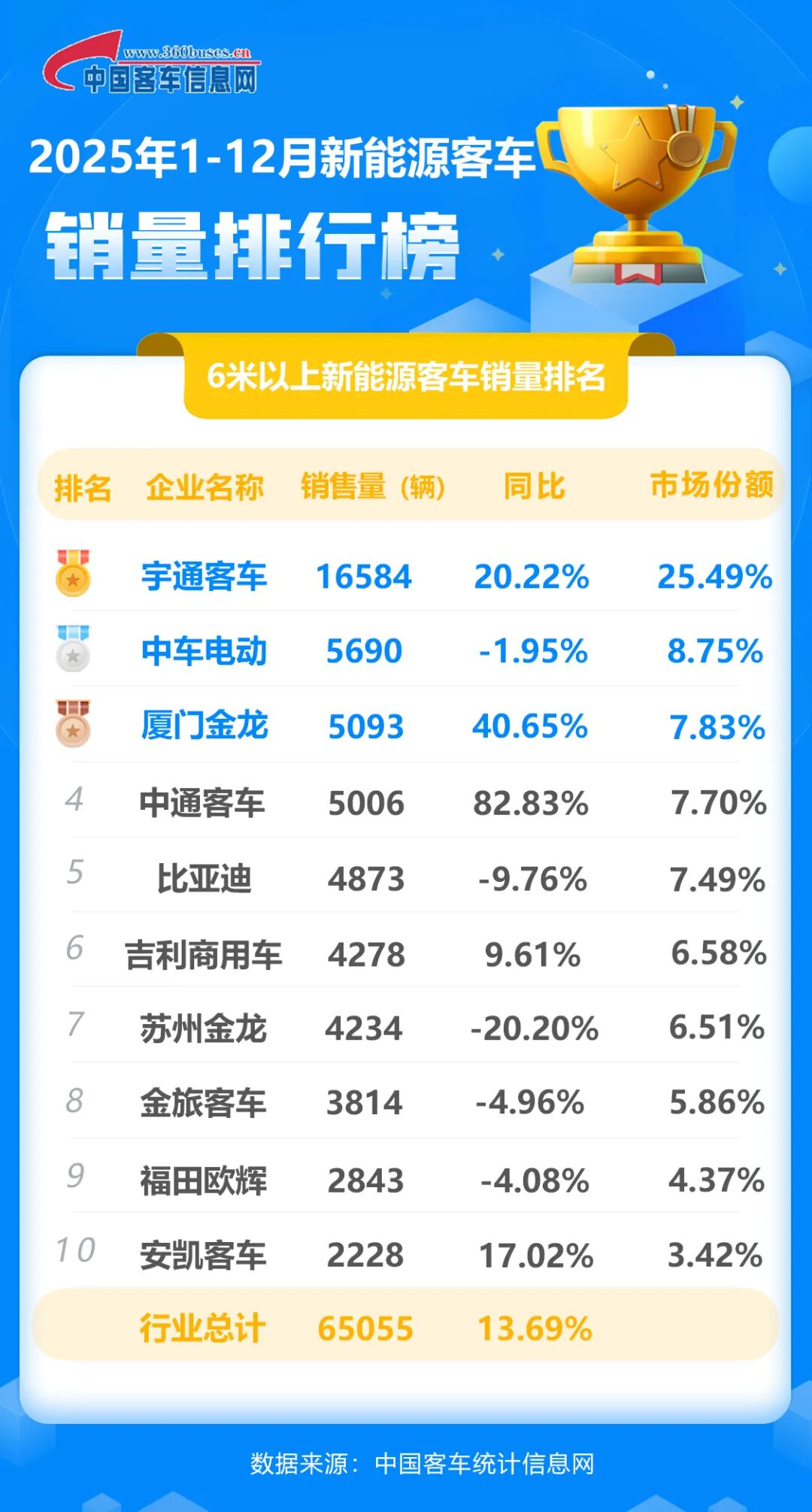 中国客车统计信息网最新数据显示,2025年全年,6米以上新能源客车累计销量达到65055辆,同比增长13.69%。其中,中车电动累计销售新能源客车5690辆,市场份额为8.75%。