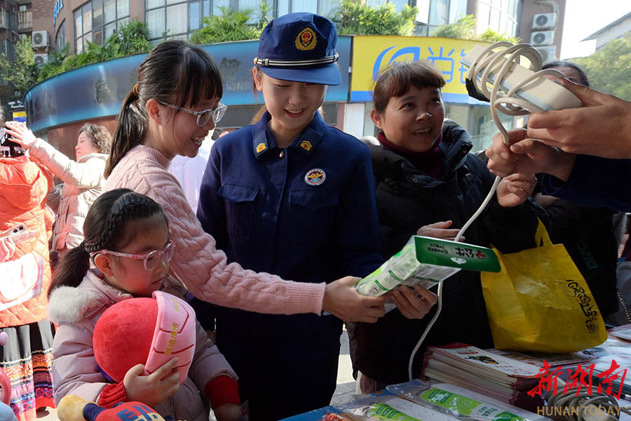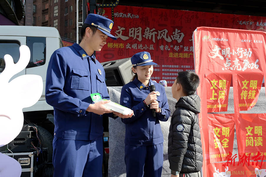 1月11日,郴州市消防救援支队在龙腾广场小区文明实践集市开设宣传点,通过现场讲解防火知识、更换老旧排插、开展有奖互动等多种形式,面对面为居民普及冬季防火知识,全力筑牢冬季消防安全防线。 骆静 摄(湖南图片库)