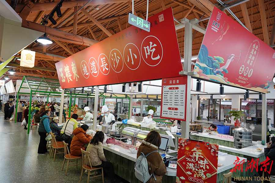 1月12日,长沙市开福区油铺街,市民在湘供市集内品尝地道小吃。这座由长沙弹簧厂老厂房改造的市集于1月10日正式开业,集社区生鲜、便民食堂、邻里服务于一体。市民不仅能在这买到肉、蛋、菜,还可通过手机下单生鲜等产品,预约社区医生,并享受免费配钥匙、缝补衣服等便民服务。湖南日报全媒体记者 徐行 摄