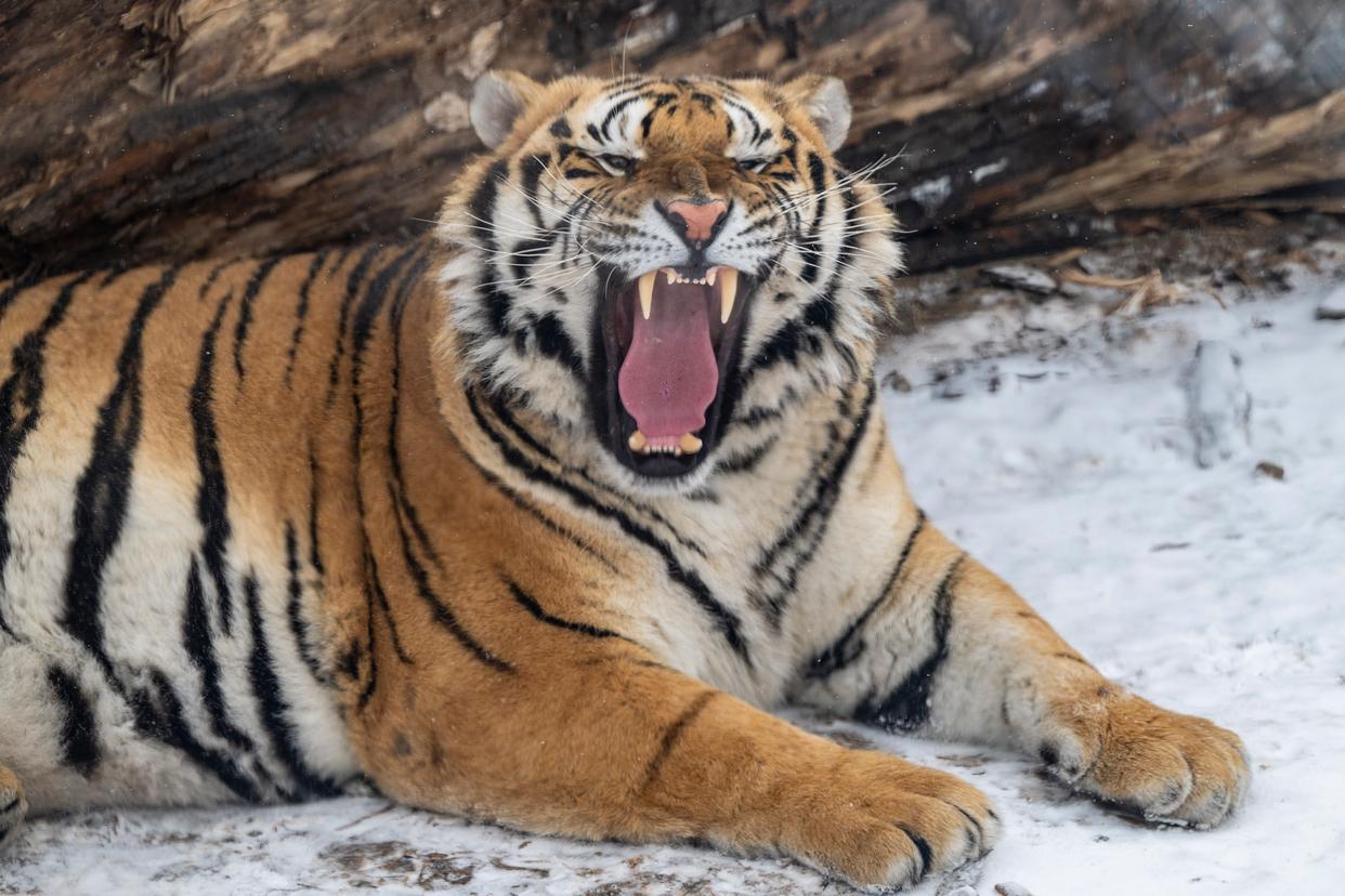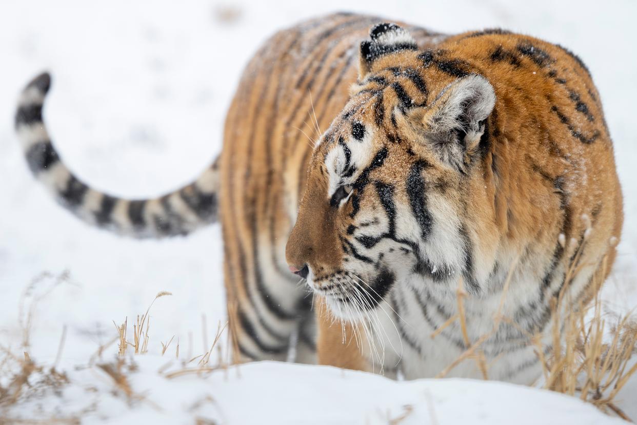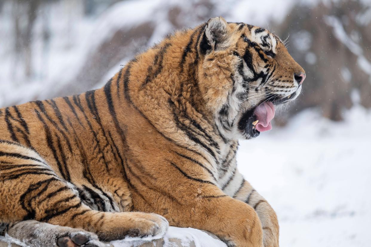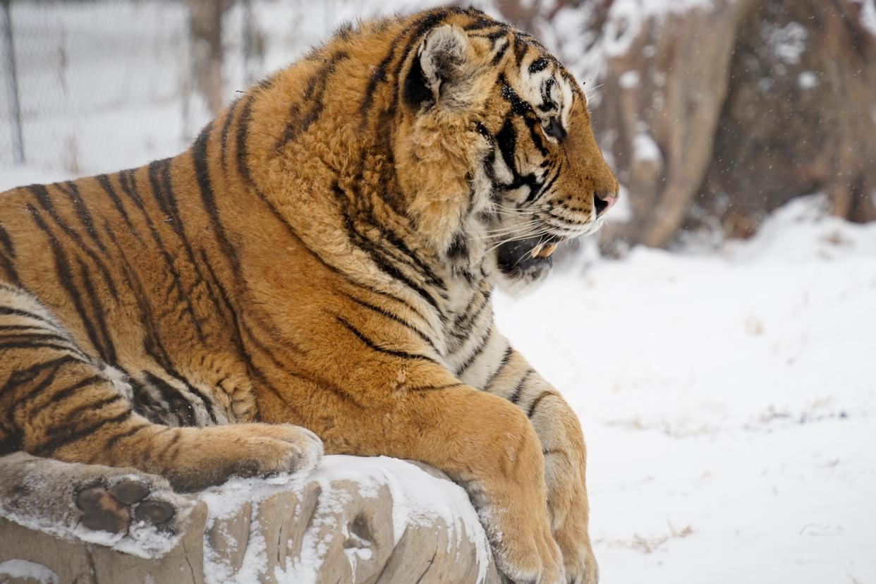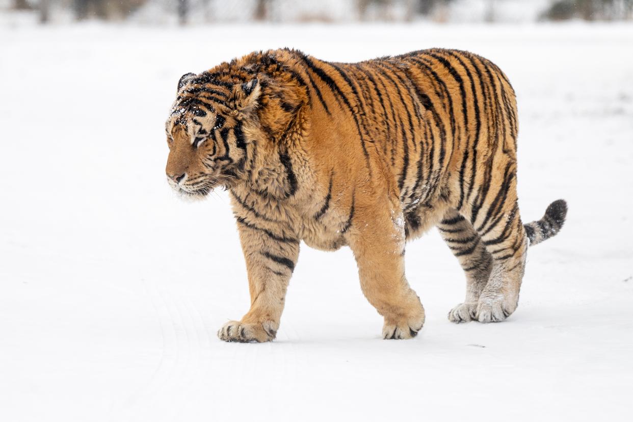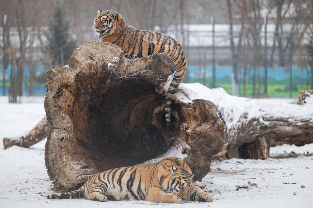 1月12日,冰城哈尔滨市迎来降雪天气,在黑龙江东北虎林园,散放区的东北虎在雪地活动。