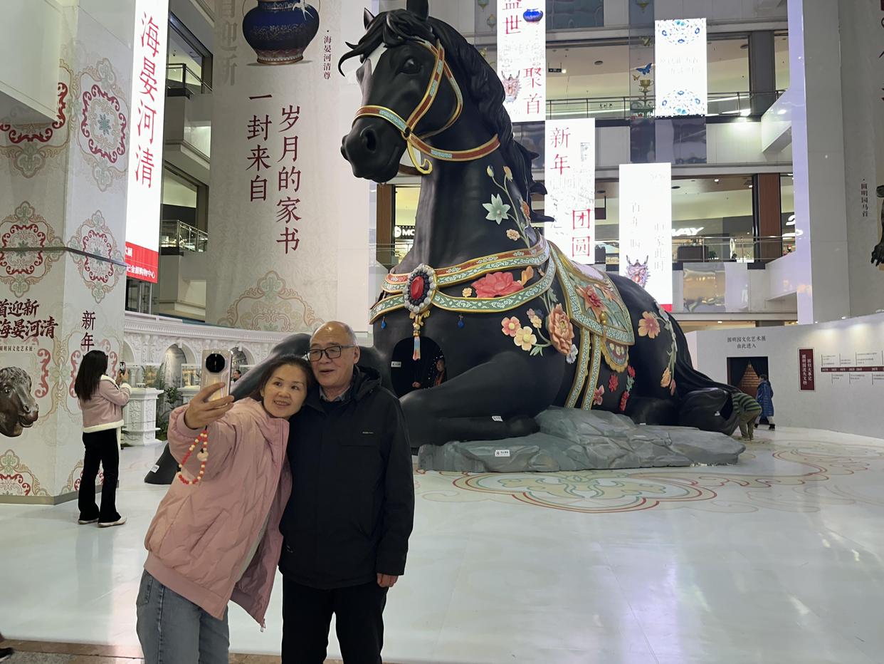 ▲市民在世纪金源购物中心商场的黑色巨马前拍照