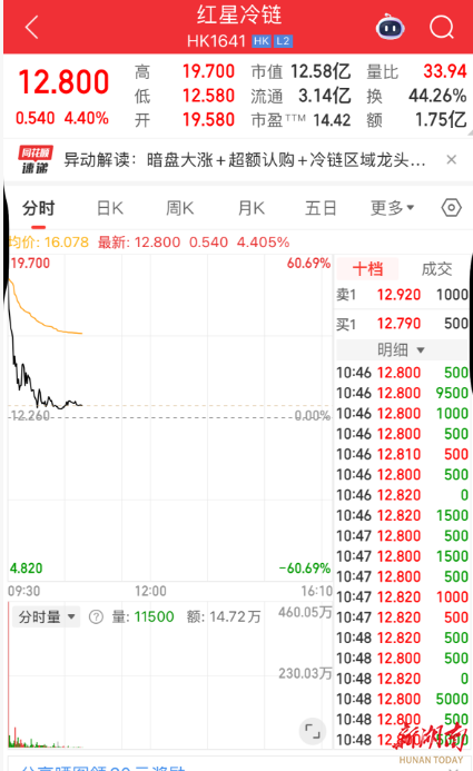 截至记者发稿时,红星冷链涨幅收窄至4.40%,报12.80港元/股,市值12.58亿港元。